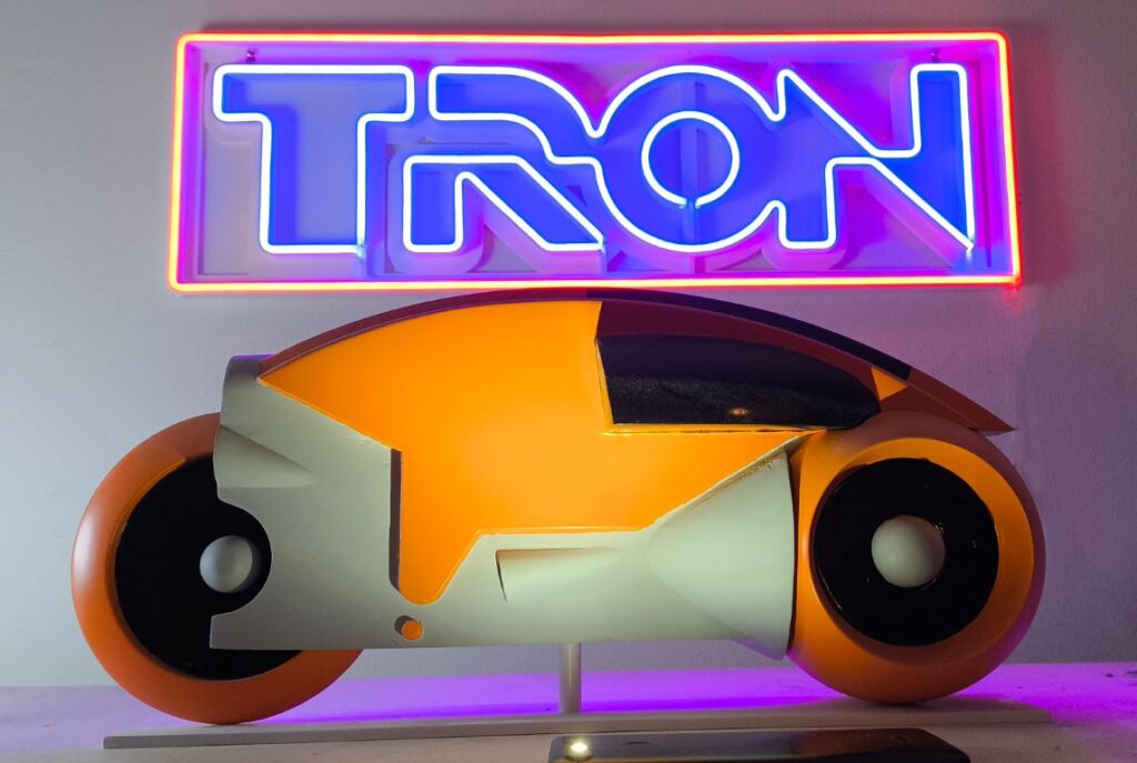 Hinter meinem Lightcycle-Modell an die Wand: Montiert, angeschlossen, lights on! Das Ding strahlt wie aus dem Film – 650 mm breit, rot-blaues Neon-Feuerwerk, das die Werkstatt in 'ne Sci-Fi-Höhle verwandelt. Kunden gucken rein und sagen: "Wow, Steven, das ist Kunst!" Bin total happy – von 1 Meter "zu wenig" zu 'nem Statement-Piece. Nächstes Mal mehr Meter bestellen und vielleicht 'nen R2-D2 davor parken. Wer will so 'n Custom-Neon für seinen Roboter? Meldet euch!