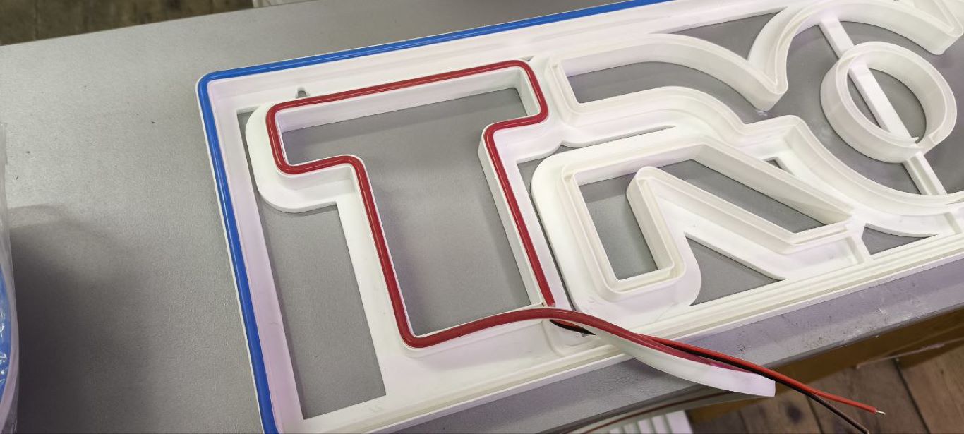 Streifen rein: Rot außen für den dramatischen Glow, Blau innen für die scharfe Schrift. Alles passgenau eingeklemmt, keine Falten, kein Kleber-Chaos. Anschluss? Ein simples DC12V-Netzteil (aus dem Elektronik-Vorrat, klar), Kabel sauber verlötet – ich reparier ja täglich Geräte, da mach ich keine halben Sachen. Testlauf: Zisch! Perfektes Neon-Leuchten, als wär ich im Grid von Tron gelandet. Kein Funke, kein Brandalarm.